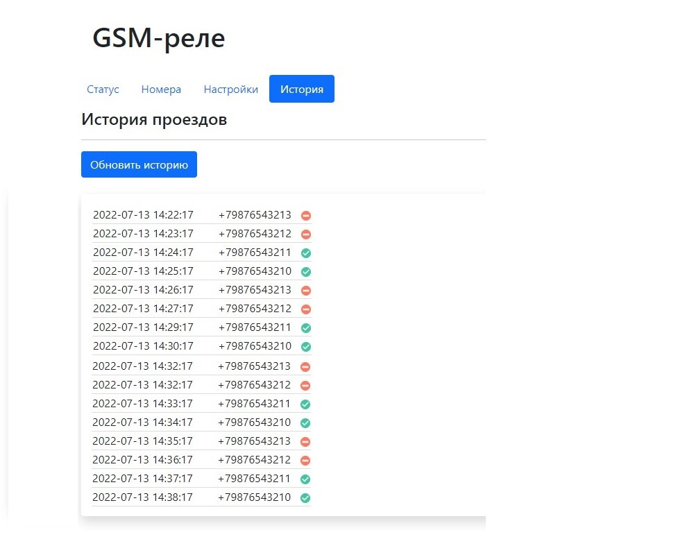 Подъехав к шлагбауму, водитель звонит на реле. Если номер водителя есть в списке, реле выдаёт сигнал на открытие шлагбаума. Проезд фиксируется во внутреннем журнале устройства